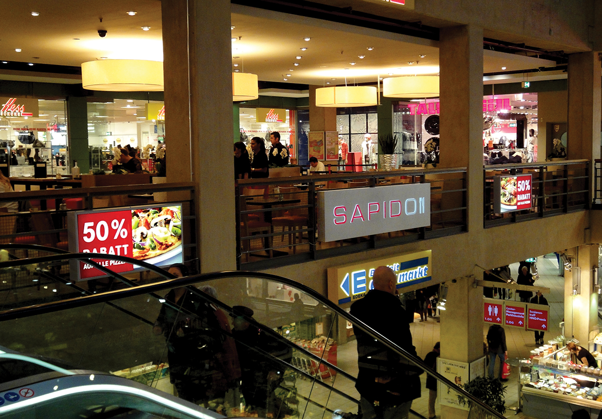 For the Italian restaurant chain SAPIDO, sis was commissioned to deliver the company signage and three additional illuminated advertising systems for the Altonaer Mercado. For the restaurant itself, the company logo was executed as a combination of individual letters and a lightbox, with 35 mm thin LED-illuminated elements. Two of the illuminated advertising systems at the escalators were additionally equipped with digital prints by sis. A third illuminated advertising system in the escalator area featured the company logo cut out from an aluminum frame and complemented with acrylic letters.