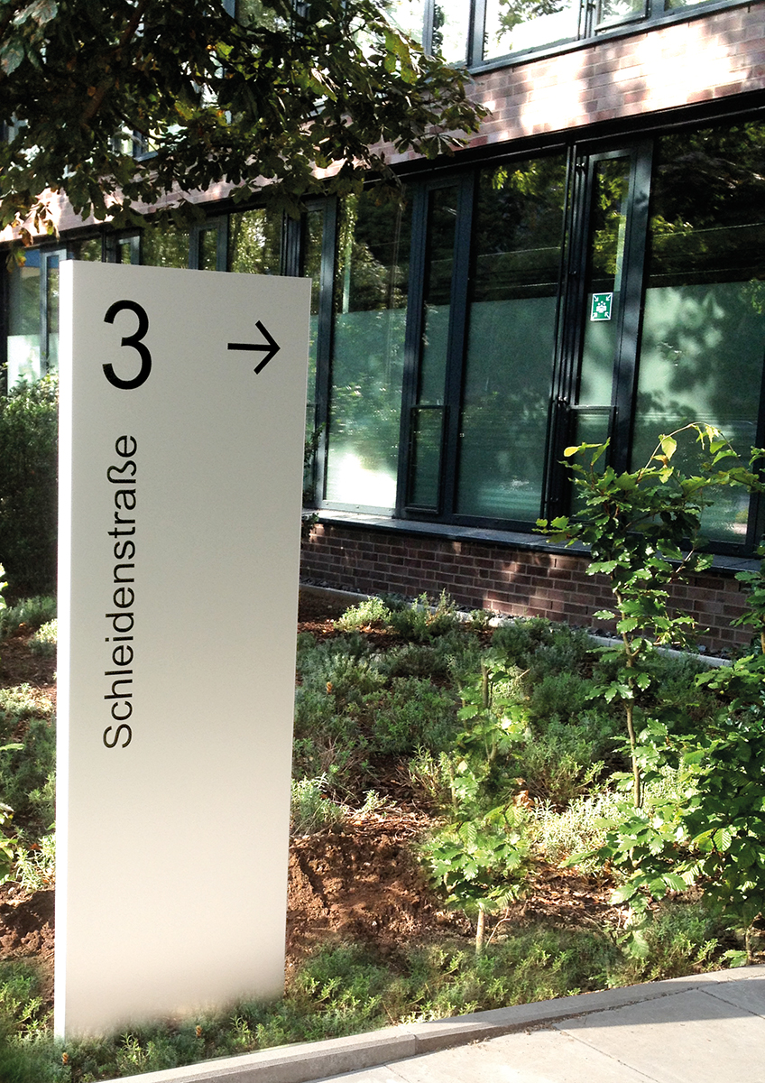For the office building on Schleidenstraße in Hamburg, sis designed an exterior totem and wall signs for both the interior and exterior using the TWINsign®1 system. Additionally, the entrance doors were equipped with vinyl lettering.