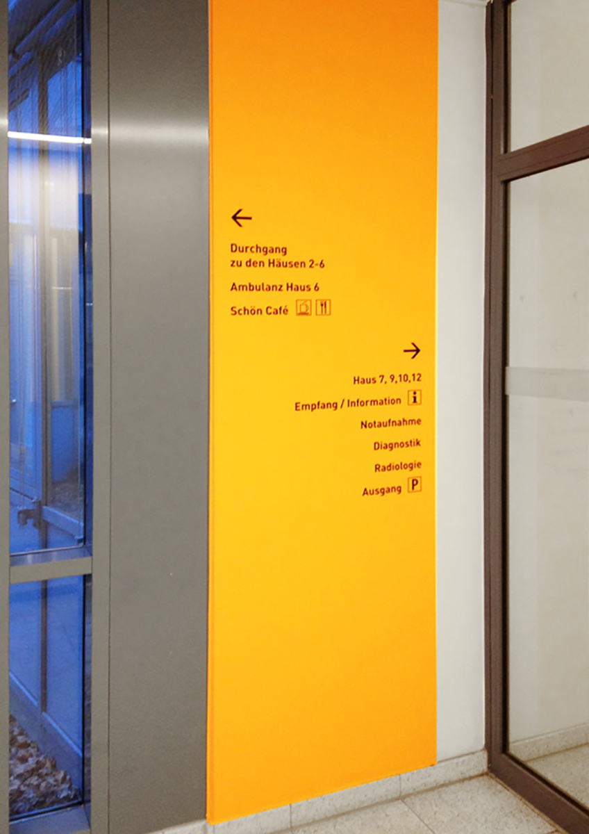 Together with Schön Klinik in Hamburg Eilbek, we look back on a long-standing and successful collaboration. Since 2008, sis has been responsible for the entire exterior wayfinding system, including display cases and site plans. Through sis’s ongoing update service, all information is consistently kept current. In addition to the wayfinding system with steles and site plans, we develop bespoke solutions for Schön Klinik, such as window films with a special infrared-absorbing protective coating, which are required due to camera recordings.
