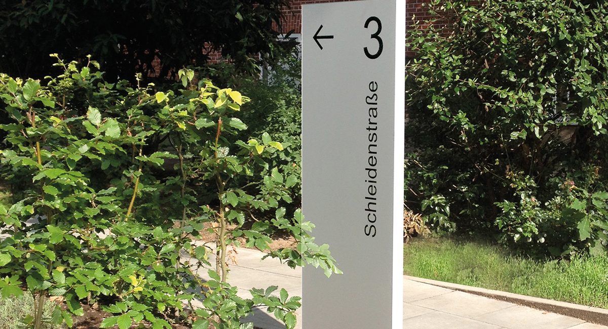 Für das Bürogebäude an der Schleidenstraße in Hamburg plante sis eine Aussenstele sowie Wandschilder im Innen- und Aussenbereich des Systems TWINsign®1. Ergänzend wurden die Eingangstüren mit Folienbeschriftungen versehen.