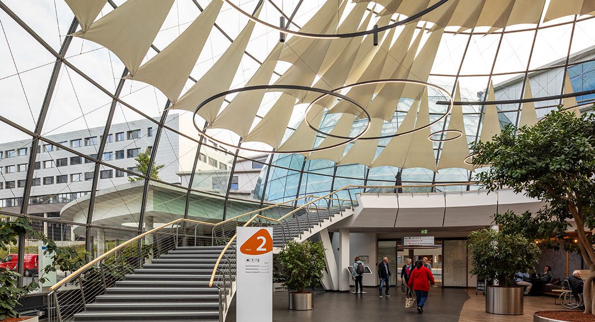 Herzstück des Neubaus des Rhön-Klinikum Campus ist das Zentrum für ambulante Medizin mit seinen modernen Glaskuppeln, welches im Zentrum des Campus als Drehkreuz für die Patienten-navigation fungiert.