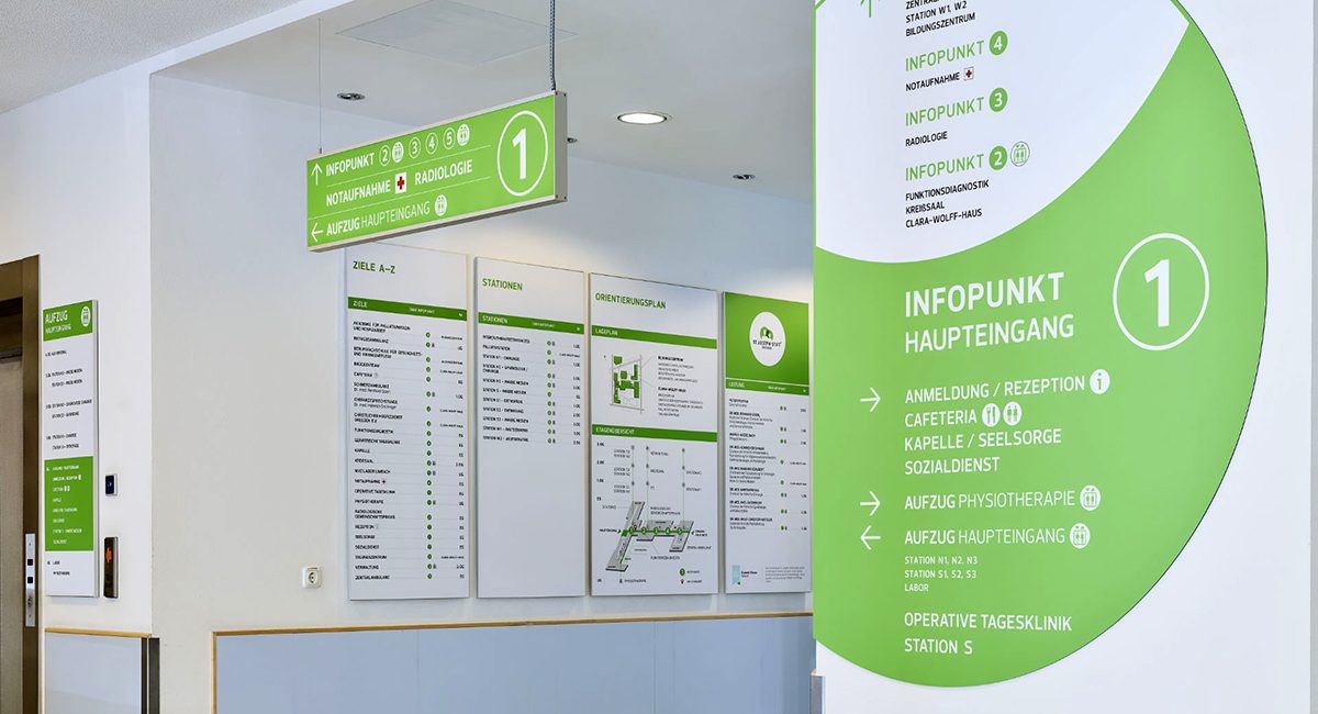 Der gesamte Projektablauf bis zur Ausschreibung und Umsetzung wurde von uns begleitet. Entstanden ist ein frisches, modernes Weggeleit- und Orientierungssystem, passend zur CI des Hauses. Im Außenbereich führen beleuchtete Stelen um den Campus zu nummerierten Zugängen. Die „Infopunkte“ bilden die Eyecatcher im Innenbereich. Diese markanten Punkte kennzeichnen die zentralen Anlaufstellen für Untersuchungen und Funktionsbereiche.